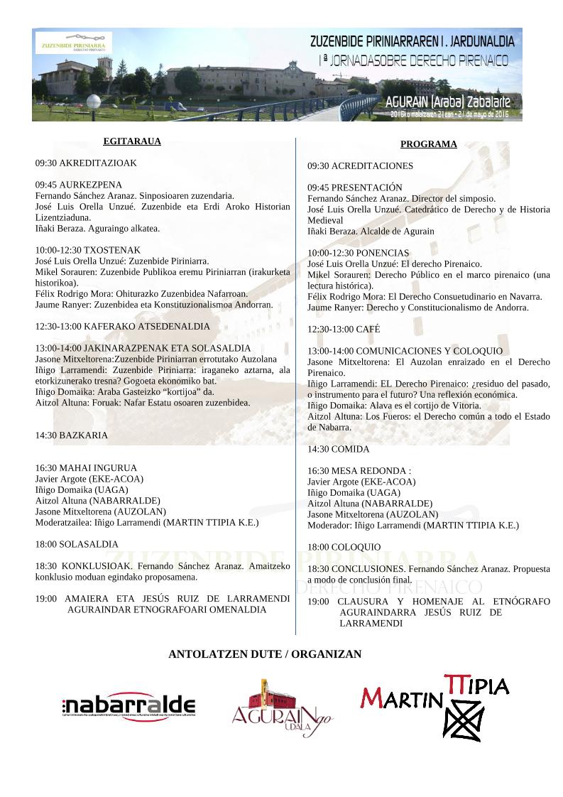 Martin Ttipia Kultur Elkartea (Asociación Cultural Martín Ttipia) y Nabarralde Fundazioa (Fundación Nabarralde) han organizado la 1ª JORNADA SOBRE DERECHO PIRENAICO. Mi intervención tendrá por título, “El derecho consuetudinario en Navarra. De la revolución de la Alta Edad Media al Fuero General”.