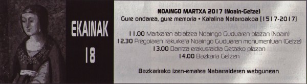 - MARCHA DE NOAIN 2017, en Noain-Getze, el domingo 18, a partir de las 11:00, con inicio en la plaza de la Batalla de Noain (Noain).