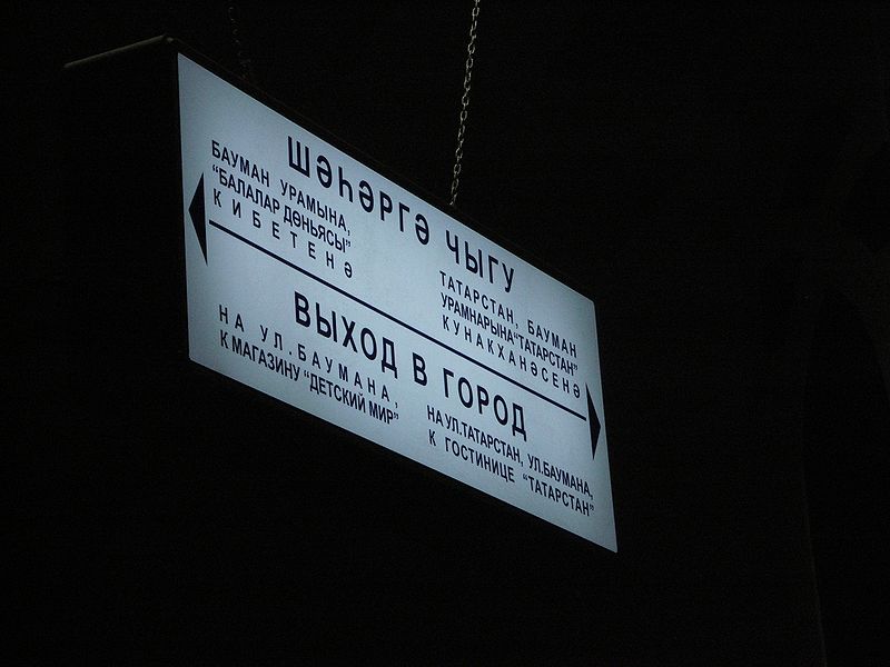 Señalización del metro de Kazan, en tatar (superior) y ruso (inferior) (Fuente: Wikipedia)
