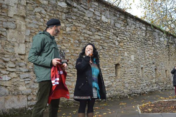 Eguraldiak gupidatsu portatu zen gurekin, eta, zorionez, Martin Ttipia Leku eder eta ikusgarrian ospatu ahal izan genuen sari ematea. Saria Asiskori luzatu eta gero, Jare Dantza Taldeko lagunek Aurreskua dantzatu zioten saridunari, eta, ekitaldia amaitzeko, Oihane Perea bertsolariak bi gorespen bertso kantatu zizkion, bai gure gonbidatuari eta baita Nafarroari ere. Agurtu baino lehen, ezusteko oparia egin zigun Asiskok: Martin Ttipia tenentearen irudi baten originala. Eskerrik asko, Asisko!! Eta, amaitu bezain laster, euri-zaparrada ederra hasi zitzaigun….. patuaren laguntza ote?